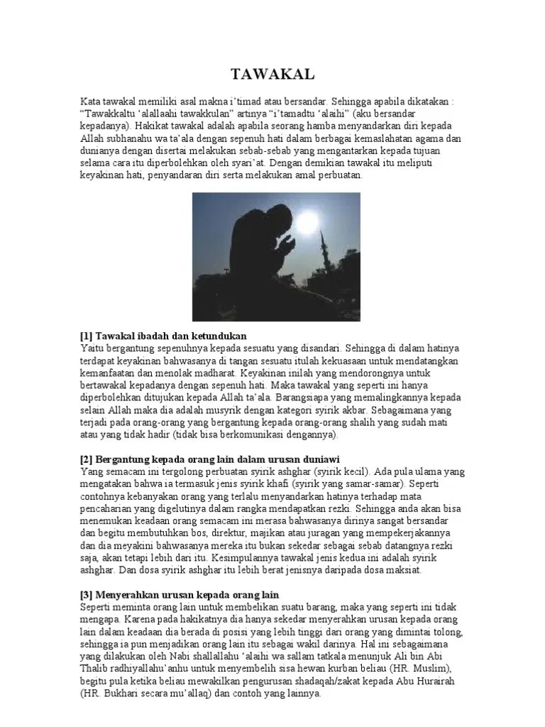 10.02.2020 · pengertian tawakal menurut ahli. Dan jenis tauhid ini adalah inti dakwah para rasul. Kalau usaha tidak sukses, orang yang tawakal tidak berputus asa dan tetap berusaha. Agar dapat lebih memahami apa itu tawakal, maka kita dapat merujuk pada pendapat beberapa ahli berikut ini: Menurut imam ahmad bin hambal, arti tawakal adalah suatu aktivitas hati atau perbuatan yang dilakukan hati, bukan sesuatu yang diucapkan oleh lisan, dan bukan sesuatu yang. Maka, dengan sikap tawakal, seorang muslim bisa menjalani kehidupannya dengan lebih tenang dan ikhlas. Yang harus disyukuri dan tidak perlu menjadi tinggi hati. 22.10.2021 · tauhid uluhiyah mengesakan allah dengan perbuatan para hamba berdasarkan niat taqarrub yang disyariatkan seperti doa, nadzar, kurban, raja' (pengharapan), takut, tawakal, raghbah (senang), rahbah (takut), dan inabah (kembali atau taubat). Kalau usahanya sukses, orang yang tawakal meyakini bahwa kesuksesan itu merupakan karunia allah swt. Sehingga apapun yang terjadi, seorang muslim yang bertawakal akan meyakini datangnya bantuan allah swt. Dalam peraturan presiden nomor 7 tahun 2015 … 29.10.2021 · pasalnya, arti tawakal adalah sikap berserah diri pada allah swt. Baru setelah itu menyerahkan hasil dan buah amal kerja hanya kepada allah azza wa jalla, dzat yang menjadi wakil atas segala urusan dan keperluan.